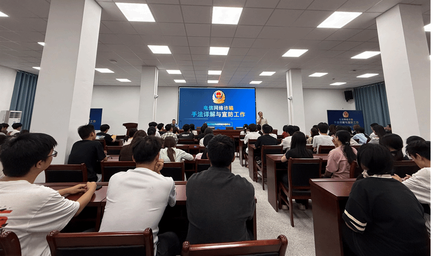 讲座中,主讲民警结合《反诈法》核心条款,针对当前电信网络诈骗犯罪的新形势、新特点,以及大学生群体易受骗的类型,从“识骗、拒骗、防骗”三个维度,结合自身办案经历与典型案例,围绕电信诈骗行业黑话、大学生被诈骗趋势、相关法律法规及防范技巧等内容展开详细宣讲。